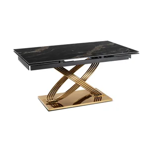 Rozkładany stół IBIZA w eleganckim połączeniu czarnego marmuru ze złotymi żyłkami i złotą metalową podstawą to idealny wybór do nowoczesnych wnętrz, które wymagają zarówno funkcjonalności, jak i wyjątkowego designu. W standardowej wersji stół ma wymiary 160 × 96 cm, wysokość 77,5 cm oraz głębokość 90 cm, a jego blat o grubości 1,1 cm wykonany ze spieku kwarcowego łączy trwałość z efektownym wyglądem. Dzięki praktycznej funkcji rozkładania długość stołu można zwiększyć do 240 cm, co pozwala komfortowo przyjąć nawet 12 osób podczas rodzinnych obiadów, świąt czy eleganckich przyjęć. Blat ze spieku kwarcowego jest odporny na wilgoć, uszkodzenia i łatwy w utrzymaniu czystości – wystarczy wilgotna ściereczka, aby przywrócić mu nieskazitelny wygląd. Stabilna, złota podstawa z metalu nie tylko zapewnia bezpieczeństwo użytkowania, lecz także dodaje meblowi luksusowego charakteru, a nowoczesny układ nóg w krzyżującym się wzorze podkreśla elegancki, niebanalny design.