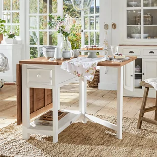 Niezwykle piękny antyczny design. W stylu rustykalnym – naturalny blat i rama z antycznym wykończeniem. Rozkładane blaty po obu stronach. To mały cud, który nie zajmuje wiele miejsca w Twojej przestrzeni. Blat rozłożysz w kilka sekund – i zawsze możesz go złożyć.
