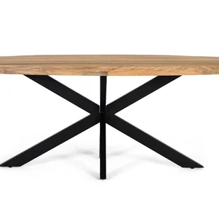 Ten elegancki owalny stół jadalny łączy nowoczesny design z wysokiej jakości naturalnymi materiałami. Blat wykonany jest z litego drewna mango, z naturalnym wykończeniem, które podkreśla jego unikalną strukturę. Owalny kształt blatu zapewnia płynniejszy przepływ wokół stołu, a czarna, żelazna podstawa o krzyżowym wzorze zapewnia doskonałą stabilność i nowoczesny, industrialny akcent, który elegancko kontrastuje z drewnem. ROZSTAW NOG - 120 CM, WYSOKOŚĆ NOG - 71 CM, BLAT - 5 CM