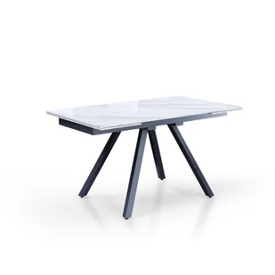 Stół rozkładany EKO 1 - Podstawa wykonana z matowej, malowanej na szaro stali - Blat wykonany z ceramiki o grubości 10 mm z połyskującym, białym marmurowym wykończeniem - Przedłużenia umieszczone pod blatem - Wys. 75 x Gł. 80 x Szer. 140/210 cm - Odległość między nogami na krótszym boku: szer. 58 cm u dołu, gł. 28 cm u góry - Odległość między nogami na dłuższym boku: szer. 89 cm u dołu, gł.