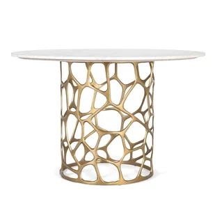 Ten elegancki, okrągły stół jadalny łączy w sobie wyrafinowane materiały i nowoczesny design. Jego blat wykonany jest z białego marmuru z szarymi żyłkami, którego polerowane wykończenie podkreśla naturalne piękno kamienia. Podstawa, również okrągła, wykonana jest z aluminium i charakteryzuje się siatkową strukturą o splocie, która nadaje mu optycznej lekkości bez utraty stabilności. Złote wykończenie dodaje mu nuty wyrafinowania i luksusu, tworząc harmonijny kontrast z surowością marmuru. WYSOKOŚĆ PODSTAWY: