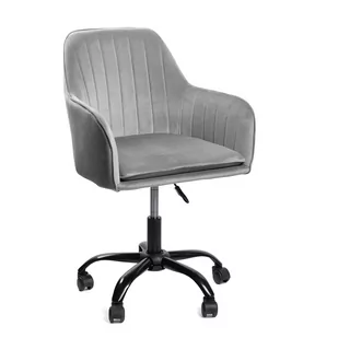 Elegancji dodają przeszycia tworzące wzór w pionowe paski. Krzesło obraca się o 360 stopni i ma mechanizm regulacji wysokości dzięki gazowemu systemowi podnoszenia. Mebel osadzony jest na czarnej podstawie. Materiał Siedzisko i oparcie są ergonomicznie zaprojektowane, tapicerowane miękką tkaniną welurową w szarym kolorze, dzięki czemu krzesło jest przyjemne w dotyku. Zaletą weluru użytego do obicia siedziska jest nie tylko szykowny wygląd, ale też odporność na uszkodzenia.