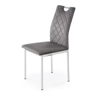 Smukłe, metalowe nogi w kolorze chromu tworzą doskonały kontrast z szarością tapicerki, podkreślając nowoczesny design krzesła. Okrągły profil nóg nadaje konstrukcji lekkości, a jednocześnie zapewnia stabilność i trwałość. Dzięki praktycznemu uchwytowi na oparciu, krzesło jest nie tylko stylowe, ale i funkcjonalne – można je łatwo przestawiać, dopasowując do zmieniających się potrzeb wnętrza.