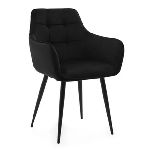 Krzesło tapicerowane jest aksamitną w dotyku tkaniną Bluvel. Siedzisko jest wypełnione kilkucentymetrową warstwą miękkiej pianki, a uroku dodaje stylowe pikowanie zdobiące przednią stronę oparcia. Subtelne nogi wykonane zostały ze stali malowanej w czarnym kolorze. Dodatkowo krzesło posiada podłokietniki.