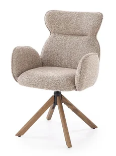 Velino to eleganckie i funkcjonalne krzesło obrotowe zaprojektowane z myślą o osobach ceniących komfort i styl. Tapicerowane miękką, wysokiej jakości tkaniną w kolorze ciemnego beżu, idealnie wpisuje się w nowoczesne i naturalne wnętrza, dodając im ciepła i przytulności. Nogi wykonane są z litego drewna dębowego w odcieniu jasnego orzecha, co podkreśla solidność oraz naturalny charakter mebla. Ergonomiczny kształt siedziska oraz wygodne podłokietniki sprawiają, że Velino doskonale sprawdza się zarówno w domowym biurze, jak i w przestrzeni komercyjnej, zapewniając wygodę podczas wielogodzinnej pracy. Dodatkowo funkcja obrotu zwiększa jego praktyczność, umożliwiając swobodne poruszanie się bez konieczności wstawania.