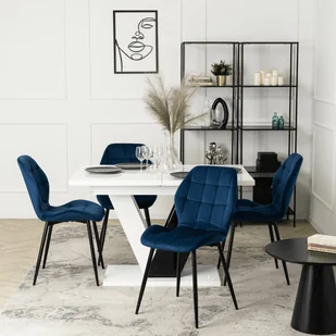 Zestaw 4 krzeseł tapicerowanych LUCKY w kolorze granatowym Odkryj wyjątkowy zestaw czterech tapicerowanych krzeseł Lucky - mebli, które wprowadzą do Twojego wnętrza szczyptę klasy i odrobinę zaskakującej elegancji! Granatowa tapicerka wykonana z miękkiego weluru to prawdziwa uczta dla zmysłów, a jej iście królewski kolor natychmiast przyciąga wzrok. Połączenie tej bogatej barwy z prostymi, czarnymi nogami tworzy duet o wyważonym charakterze - elegancki, ale z nutą nowoczesnej prostoty. Co sprawia, że są wyjątkowe? - Granatowy welur - miękki, stylowy i odporny na mechacenie; wprowadza nutę elegancji i jest wyjątkowo przyjemny w dotyku.
