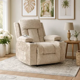 Fotel masujący BOX w beżowym welurze to idealne miejsce na codzienny odpoczynek. Rozkładany, z funkcją masażu i trzema pozycjami do wyboru. Miękka tkanina, praktyczne uchwyty na napoje i boczna kieszeń sprawiają, że relaks jest zawsze na wyciągnięcie ręki.