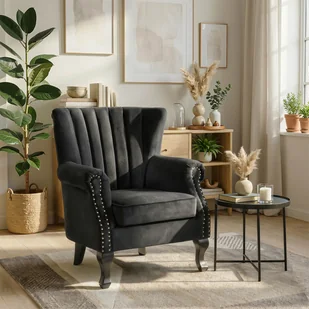 Elegancki fotel wypoczynkowy Mallo w czarnym welurze z dekoracyjnymi dżetami, przeszyciami i solidnymi drewnianymi nogami. Idealny do wnętrz glamour i minimalistycznych, ale także sypialni lub przedpokoju. Luksus w przystępnej cenie.
