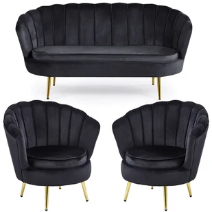 Zestaw Glamour: sofa + 2 fotele muszelki ELIF czarny welur, złote nogi