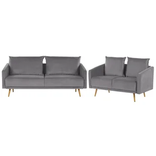 Zestaw dwóch szarych sof ze złotymi nóżkami. Niezwykła wygoda, miękkie w dotyku obicie i stylowe wykończenie - to niezaprzeczalne zalety tego szarego kompletu. Siedzisko i poduchy oparciowe wypełnione są pianką oraz sprężynami kieszeniowymi, które pozwalają na długi i komfortowy wypoczynek. Zestaw pomieści co najmniej pięć osób, co czyni go wspaniałym miejscem do przyjmowania gości. Welurowe tapicerowanie i złote metalowe nóżki świetnie pasują do wystroju glam, lecz nie zawahaj się łączyć tej sofy z dodatkami w stylu boho, czy retro.