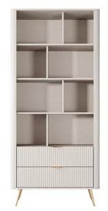 Wysoka, smukła sylwetka mebla, ryflowane fronty oraz złote akcenty tworzą spójną i wyrafinowaną całość. To idealny wybór do salonu, domowego biura czy gabinetu, gdzie liczy się zarówno porządek, jak i piękno detalu. Dzięki swojej uniwersalnej stylistyce Nook 3X wprowadza do wnętrza atmosferę ładu, lekkości i nowoczesnej elegancji. Regał Nook 3X – elegancja i porządek w jednym: Przemyślany układ półek i szuflad ułatwia przechowywanie różnorodnych przedmiotów.