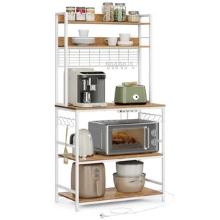 Wszechstronny regał kuchenny wykonany z płyty MDF i stali stopowej w kolorystyce dębowo-białej z zintegrowaną listwą zasilającą z 4 gniazdkami