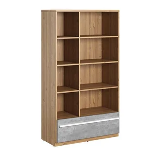 Regał do pokoju dziecka , szuflada, Plano, 90x41x161 cm, biel, szary, dąb nash, mat. Stylowy regał-biblioteczka na książki, pomoce naukowe i dekoracje, który wyróżnia się oryginalnym charakterem. Mebel wyposażono w szeroką, pojemną szufladę , w której komfortowo można przechować, np. dokumenty lub drobne przedmioty. Smukły korpus, półki w kolorze drewna w kompozycji z szarą szufladą sprawiają, że regał prezentuje się nowocześnie i z łatwością dopasuje się do różnych stylów.