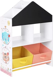 Kolorowy regał domek ! 2 pojemniki materiałowe, 2 otwarte półki oraz 4 przegródki w górnej części zmieszczą wiele zabawek, klocków i książek. Górne przegródki można zmienić z 4 mniejszych na 2 duże dzięki wyjmowanym ściankom. Tablica pozwoli dzieciom rozwiną artystyczne zdolności. Regał posiada zabezpieczanie przed przewróceniem, zapewniając bezpieczną zabawę. Uwagi: Do czyszczenia używać wilgotnej szmatki.