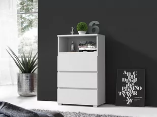 Niski regał młodzieżowy Neo 03 to połączenie typowego regału z półkami i komody. Wyposażony został w 3 szuflady oraz półkę, którą można zagospodarować na wystawkę lub jako miejsce na segregatory. Całość, podobnie jak w regałach, domyka od góry wieniec. Regał Neo 03 będzie odpowiednim, uniwersalnym rozwiązaniem do każdego rodzaju pomieszczenia. Mebel wyprodukowany został z płyty laminowanej o grubości 18 mm, oklejony obrzeżem z tworzywa sztucznego ABS o grubości 0,6 mm.
