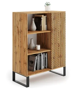 Szafka FONDI Szafka FONDI to niezwykle funkcjonalny mebel do Twojego salonu, który posiada prosty, a jednocześnie przyciągający wzrok wygląd inspirowany stylem loftowym. Przestrzenie półkowe są idealnym miejscem na ekspozycję zdjęć, książek oraz wielu innych ozdób. W szafce możesz przechowywać najróżniejsze przedmioty, dzięki czemu utrzymasz ład oraz porządek. Polecamy również inne meble z tej serii, które dostępne są na naszych pozostałych aukcjach WYKONANIE: front i korpus – płyta meblowa laminowana obustronnie o grubości 18 mm wszystkie krawędzie starannie oklejone obrzeżem ABS wysokiej jakości dekor zabezpieczony laminatem nogi metalowe o wysokości 14 cm pomalowane proszkowo w kolorze czarnym plecy szafki wykonane z płyty HDF praktyczna szafka z drzwiami otwierana prawo lub lewostronnie w zależności od miejsca przykręcenia nóżek za drzwiczkami znajdują się 2 półki Na pozostałych naszych aukcjach dostępne są inne warianty kolorystyczne: