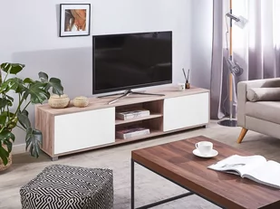 Prosty design i funkcjonalność to cechy szczególne tej komody pod telewizor. Szczegóły: Kolor: Jasne drewno, Biały. Materiał: Płyta pilśniowa. Dodatkowy materiał: Tworzywo sztuczne (polipropylen).