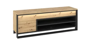Wymiary: szerokość: 155 cm, głębokość: 41 cm, wysokość: 55 cm. Gwarancja: 2 lata. Materiał: laminowana płyta meblowa o podwyższonej trwałości i gęstości, dodatkowy wykończona trwałym obrzeżem ABS. Modna kolorystyka: dąb artisan + czarny.