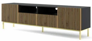 wysokość: 58 cm, szerokość: 200 cm, głębokość: 42 cm. Materiał: Wysokiej jakości laminowana płyta meblowa o klasie higieny E1, płyta MDF, metal. Modny kolor: Czarny + dąb aartisan + złoty.