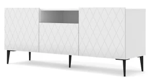 Szafka została osadzona na unikalnych nogach z nierdzewnego metalu, pomalowanych proszkowo metodą elektrostatyczną. Technika malowania proszkowego charakteryzuje się dużą trwałością, odpornością na korozje, chemikalia oraz uszkodzenia mechaniczne, dzięki czemu znacznie podnosi walory użytkowe i estetyczne mebla. Oryginalnie zdobione fronty z trwałej płyty MDF zostały wyposażone w system bezuchwytowego otwierania push to open. Geometryczne zdobienia frontów fantastycznie stylizują wnętrze nadając mu aury luksusowej elegancji. Szafka rtv Lamia posiada 3 pojemne, zamykane półki na kolekcję płyt, gier, domową filmotekę lub akcesoria.