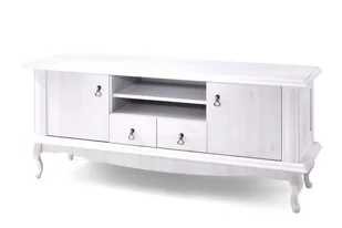 BRITON Szafka RTV 144x60x47 cm | drewno/płyta wiórowa | biały Szafka RTV BRITON w klasycznym stylu to doskonała propozycja dla osób ceniących meble najwyżej jakości. Laminat w białym kolorze oraz stylizowane uchwyty podkreśla jego design. W środkowej części znajdują się dwie małe szufladki na drobiazgi oraz dwie otwarte półki. Szafka RTV BRITON idealnie będzie pasować do klasycznego salonu, jadalni, kuchni czy holu. WYMIARY [CM]: