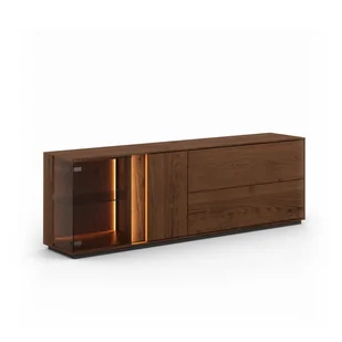 Szafka RTV dębowa szeroka z przeszkleniem i oświetleniem tabacco Collodi Szeroka szafka RTV Collodi z łatwością podkręci klimat salonu i wprowadzi porządek w strefie rozrywki. Ciepły odcień tabacco, naturalne usłojenie dzikiego dębu i olejowane wykończenie tworzą harmonijną całość, która pasuje do nowoczesnych i klasycznych wnętrz. Przeszklona witryna z podświetleniem LED dodaje lekkości, a jednocześnie eksponuje ulubione dodatki. Szafka RTV dębowa z przeszkleniem i oświetleniem tabacco Collodi – solidne drewno, wyjątkowy design Drewno dębowe cechuje solidność, którą czuć w dosłownie każdym detalu, a system tip-on umożliwia otwieranie drzwi i szuflad lekkim dotknięciem – bez uchwytów i innych zbędnych ozdobników. Olejowana powierzchnia chroni drewno przed codziennym użytkowaniem, a stabilna konstrukcja bez problemu udźwignie Twój cały sprzęt elektroniczny.