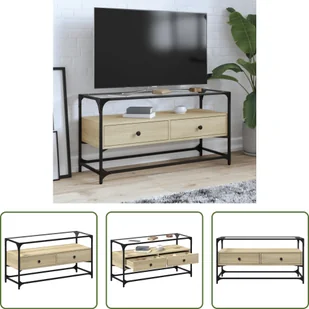 Szafka RTV ze szklanym blatem dąb sonoma 98x35x51cm materiał drewnopochodnyDzięki modnemu, a jednocześnie praktycznemu wzornictwu, ta solidna szafka pod telewizor z pewnością stanie się centralnym punktem Twojego salonu. Metalowa rama: Metalowa rama nadaje wnętrzu industrialny styl, zapewniając jednocześnie trwałość i stabilność. Dużo miejsca do przechowywania: Szafka pod telewizor oferuje dużo miejsca do przechowywania różnych przedmiotów codziennego użytku.