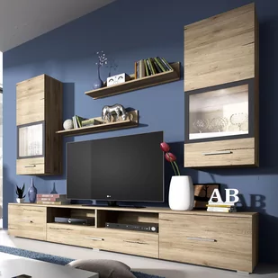 Meblościanka SARAH 220E2209Elegancka, składająca się z pięciu elementów szeroka meblościanka Sarah to dbałość o detal połączona z wysoką jakością zastosowanych w produkcji materiałów. Korpusy mebli wykonano z odpornego na zarysowania laminatu, natomiast fronty z foliowanego MDF-u. Przyjemne wybarwienie brył jasny dąb san remo doskonale komponuje się z antracytowymi, lśniącymi ramkami przeszkleń. Meblościanka SARAH 220E2209 składa się z następujących elementów: 1 szafka RTV z 2 klapami, szufladą i dwoma wnękami 2 witryny wiszące 2 półki.