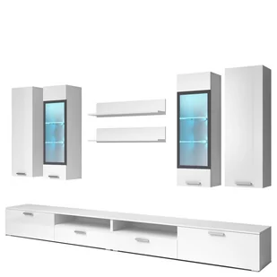 Meblościanka SARAH 22972210Elegancka, składająca się z ośmiu elementów szeroka meblościanka Sarah to dbałość o detal połączona z wysoką jakością zastosowanych w produkcji materiałów. Korpusy mebli wykonano z odpornego na zarysowania laminatu, natomiast fronty z foliowanego MDF-u. Matowy korpus i fronty w białym wysokim połysku doskonale komponują się z czarnymi, lśniącymi ramkami przeszkleń. Meblościanka SARAH 22972210 składa się z następujących elementów: 2 szafki RTV – każda z klapą, szufladą i wnęką tworząca półkę 2 szafki wiszące 2 witryny wiszące 2 półki.