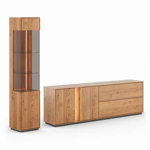 Zestaw mebli do salonu – komoda i witryna lewa drewniana dębowa Collodi Zestaw mebli dębowych z kolekcji Collodi prezentuje się tak, jakby ktoś zatrzymał w drewnie ciepło letniego popołudnia. Naturalny odcień dębu z wyraźnym rysunkiem słojów tworzy kompozycję, która nigdy się nie nudzi. Ten komplet mebli drewnianych odnajdzie się w minimalistycznym apartamencie z nowoczesną aranżacją równie naturalnie, jak w rodzinnym domu pełnym wspomnień. Dębowa witryna i komoda budują w przestrzeni spokojny, wyważony komplet mebli, który nie dominuje, ale przyciąga wzrok. Zestaw mebli drewnianych – trwałość dzikiego olejowanego dębu Pod palcami na powierzchni mebli drewnianych z kolekcji Collodi można wyczuć delikatne nierówności, subtelne wzniesienia słojów.