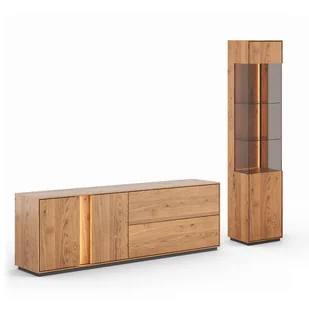 Zestaw mebli do salonu – komoda i witryna prawa drewniana dębowa Collodi Czasem wystarczy przestawić jeden element i nagle każdy salon wygląda zupełnie inaczej. Witryna po prawej stronie, niska komoda pod telewizorem – prosty zestaw mebli dębowych z kolekcji Collodi, a robi tak ogromne wrażenie. Ten komplet brył drewnianych ma kolor, który od razu ociepla wnętrze: naturalny odcień dzikiego dębu z widocznymi słojami i charakterystycznymi sękami. Meble wyglądają dokładnie tak, jak powinno wyglądać prawdziwe drewno.