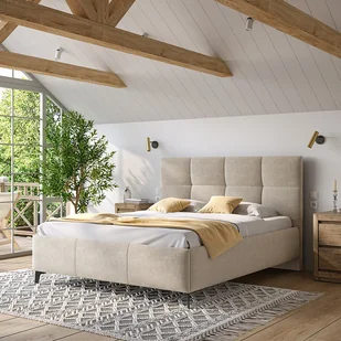 Minimalistyczne łóżko Olin marki Comforteo z praktycznym pojemnikiem na pościel oraz tapicerowanym zagłówkiem.