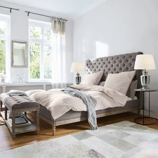 Solidna dębowa rama wykończona na biało z efektem spłukania. Duże, tapicerowane wezgłowie z delikatnym pikowaniem Chesterfield. Rama ozdobiona szlachetnymi gwoździami tapicerskimi. Idealne łóżko, gwarantujące spokojny sen i przyjemne sny. Odpocznij po królewsku i ciesz się klasycznym, bardzo eleganckim akcentem w swojej sypialni.