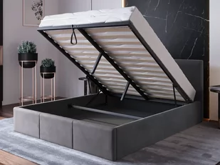 Wyposażone jest w podnoszony stelaż, który umożliwia łatwe dostęp do przestrzeni pod łóżkiem. Stelaż składa się z 2x14 listew umieszczonych na solidnej metalowej ramie z mocnymi podnośnikami gazowymi o mocy 80 N, zapewnia wyjątkowe wsparcie dla materaca i lekkie otwieranie pojemnika na pościel. To miejsce, w którym możesz przechowywać pościel, koce czy inne przedmioty, które chcesz trzymać poza zasięgiem wzroku. Ekskluzywny Design z Charakterem Kolor tkaniny welurowej nadaje łóżku niezwykłej głębi i charakteru. Pionowe przeszycia w zagłówku oraz w frontowym, niskim blacie, dodają mu unikalnego wyglądu.