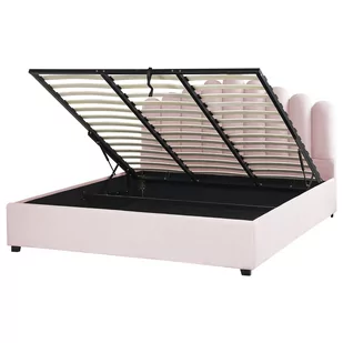 Aksamitne łóżko do przechowywania z zagłówkiem w kształcie muszli. Dodaj odrobinę luksusu do swojej sypialni dzięki temu wspaniałemu łóżku. Drewniana rama jest w całości pokryta jedwabiście miękkim aksamitnym materiałem w eleganckim pastelowym różowym kolorze. Tapicerowane łóżko ma piękne wezgłowie, które przypomina muszlę i nadaje łóżku efektowny wygląd. Rama oferuje również przestronną przestrzeń do przechowywania ukrytą pod solidną ramą z listew.