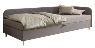 to wybór, który doskonale odnajdzie się w sypialni zarówno dorosłych, jak i najmłodszych, łącząc estetykę z funkcjonalnością. Optymalne połączenie funkcjonalności i stylu: tapicerowane miękkim welurem na wzór sztruksu wprowadza elegancję i ciepło do wnętrza zagłówek na całej długości jednego boku zapewnia wygodne oparcie dla pleców podczas czytania lub oglądania telewizji wbudowany pojemnik na pościel pozwala na utrzymanie porządku i zaoszczędzenie miejsca w sypialni dołączony materac sprężynowy typu bonell o twardości H3 gwarantuje optymalny komfort snu idealne do sypialni oraz pokoju młodzieżowego dzięki uniwersalnemu designowi spełnia różnorodne potrzeby mieszkańców Materiały, które mówią same za siebie: tapicerka wykonana wysokiej jakości miękkiej tkaniny typu szatruks o trójwymiarowej, prążkowanej strukturze odpornej na mechacenie się oraz ścieranie do 35 000 cykli w teście Martindale. nogi wykonane z wysokiej jakości litego drewna, odznaczającego się dużą wytrzymałością, stabilnością oraz naturalnym pięknym wyglądem.