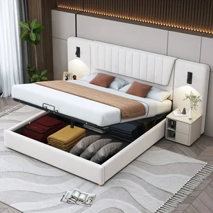 Hydrauliczna przestrzeń do przechowywania pod tym tapicerowanym podwójnym łóżkiem działa jak ukryta szafa, idealna do organizowania pościeli i innych ubrań.