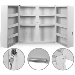 zawiera 11 przegródek magnetyczny system zamykania drzwi w tym 2 klucze łatwy montaż na ścianie wymiary: 53 x 53 x 20 cm (dł. x wys. x szer. ) waga: 7,4 kg materiał: stal biały kolor system zamykania drzwi z magnesami Zawartość opakowania: 1 x apteczka