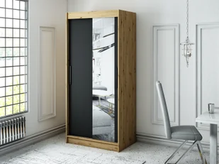 płyta laminowana o grubości 16 mm w kolorze czarnym matowym - polerowane lustro z przodu - Metalowe pręty - Uchwyty w kolorze czarnym matowym - Aluminiowa prowadnica - System przesuwny BIMAK - Krawędzie wykończone odporną na uszkodzenia okleiną PCV o grubości 0,5 mm - Tył mebla wykonany z płyty HDF Kolory - artisan + czarny mat + czarny uchwyt Dostępne szerokości: