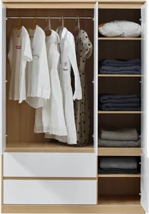 Wewnątrz szafy znajduje się drążek na ubrania i łącznie sześć dodatkowych schowków. Zapewnia to zorganizowane i przejrzyste przechowywanie. Szafa jest również wyposażona w dwie szuflady do przechowywania wszystkich przedmiotów.