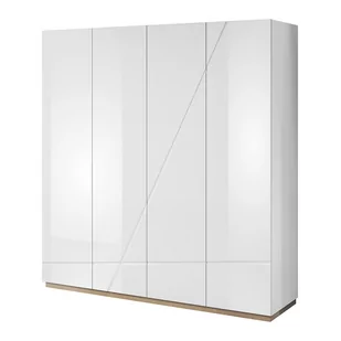Szafa czterodrzwiowa , Futura, 200x60x216 cm, biel, dąb riviera, połysk. Niezwykle pojemny, a zarazem praktyczny mebel , którego układ wnętrza można elastycznie modyfikować i dostosowywać do swoich indywidualnych potrzeb. Modny i nowoczesny, a jednocześnie uniwersalny design to zasługa sprawdzonych kolorów – ponadczasowej bieli i dekoru w naturalnym odcieniu drewna. Futurystycznego charakteru dodaje szafie geometryczne frezowanie na frontach w postaci przecinających się linii . Świetnie prezentuje się solo lub w zestawieniu z innymi meblami z kolekcji FUTURA.