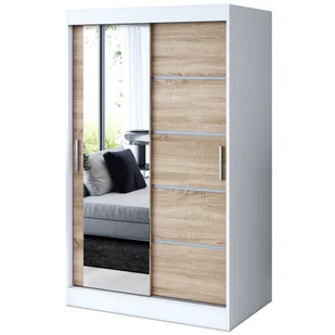 Szafa przesuwna RALF 120x200 Kolor korpusu: Biały mat Kolor drzwi: Dąb Sonoma Drzwi lewe: Lustro Drzwi prawe: Listwy ozdobne Wykonana z płyty laminowanej o g...