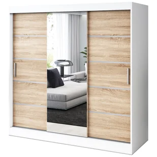 Szafa przesuwna PEPE 200x200 Kolor korpusu: Biały mat Kolor drzwi: Dąb sonoma Drzwi lewe: Listwy ozdobne Drzwi prawe: Listwy ozdobne Drzwi środkowe: Lustro W...