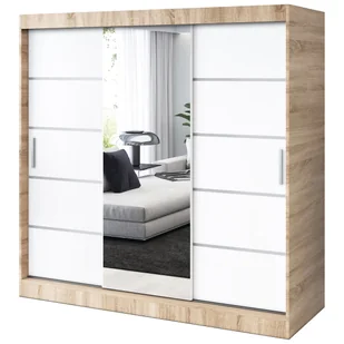 Szafa przesuwna PEPE 200x200 Kolor korpusu: Dąb Sonoma Kolor drzwi: Biały mat Drzwi lewe: Listwy ozdobne Drzwi prawe: Listwy ozdobne Drzwi środkowe: Lustro W...