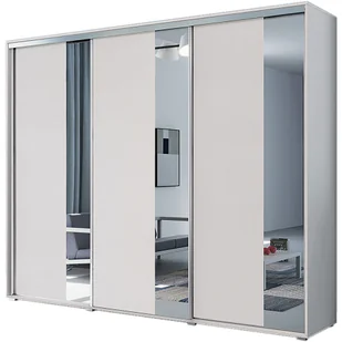 Wymiary: Wysokość: 245 cm Szerokość: 278 cm Głębokość: 62 cmWykonanie: korpus oraz fronty szafy wykonano z trwałej płyty laminowanej 16 mm, co zapewnia solidność i wytrzymałość mebla, korpusy oraz fronty szafy dostępne w różnych kolorach, co umożliwia dopasowanie do indywidualnych preferencji i stylu wnętrza, obrzeża wykończone trwałą okleiną PCV, co gwarantuje solidność i stabilność konstrukcji, stalowe listwy umieszczone z obu stron każdych drzwi ułatwiające otwieranie, szafa posiada po jednym pionowym pasie lustra na każdym z frontów, dzięki czemu pomieszczenie wyda się większe i bardziej przestronne. Funkcjonalność: