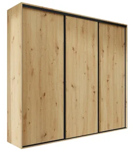 Prostą formę subtelnie podkreśla szlachetna kolorystyka w dekorze dąb artisan zestawiona z czernią dekoracyjnych pasków. Szafa została podzielona na 3 praktyczne części. W lewej i prawej części umieściliśmy aż 8 pojemnych półek na ubrania, akcesoria i dodatki. W środkowej części szafy znajduje się szeroka górna półka oraz 2 stabilne relingi na ubrania wizytowe.