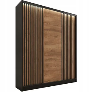 Szafa przesuwna z lamelami LOFT 150 cm dzięki swojej stylistyce nadaje pomieszczeniu niesamowitego charakteru. Odpowiedzialne zagospodarowanie przestrzeni, oraz zastosowanie licznych półek wraz z szufladami i drążkami na wieszaki zapewni ci miejsce na twoje ubrania. Natomiast zastosowanie lameli u frontu, oraz korpusu w kolorze czarnego matu czyni szafę niezwykle uniwersalną aranżacyjnie.