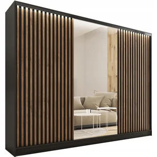 Szafa przesuwna z lustrem i lamelami LOFT 250 cm dzięki swojej stylistyce nadaje pomieszczeniu niesamowitego charakteru. Odpowiedzialne zagospodarowanie przestrzeni, oraz zastosowanie licznych półek wraz z szufladami i drążkami na wieszaki zapewni ci miejsce na twoje ubrania. Natomiast zastosowanie lameli u frontu, oraz korpusu w kolorze czarnego matu czyni szafę niezwykle uniwersalną aranżacyjnie. Dodatkowo szafa została wyposażona w pełnowymiarowe, przejrzyste lustro.