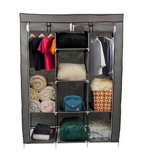 bardzo łatwa w montażu posiada: 2 drążki na wieszaki + 8 półek kolor: szary drążek: tak półka: tak zamknięcie: zamek błyskawiczny otwierane drzwi: