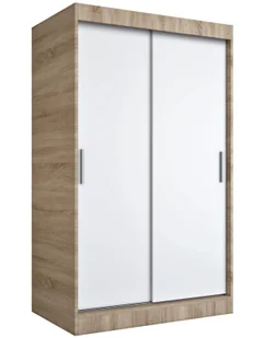 szerokość: 120 cm, głębokość: 60 cm, wysokość: 200 cm. Materiał: Wysokiej jakości laminowana płyta meblowa o klasie higieny E1 uszlachetniona cienkimi filmami melaminowymi. Modny kolor: Dąb sonoma + Biały.